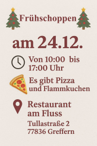 Frühschoppen am 24.12. Am Tag des Heilig Abend werden wir früher für Euch öffnen. Von 10:00-17:00 bieten wir Euch Pizza und Flammkuchen und freuen uns auf Eure Reservierung.